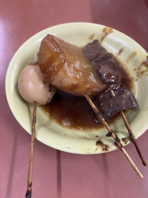 自分で手で取るセルフサービスの静岡おでんがめちゃくちゃ美味いです。味噌味と粉状の鰹節で出汁をとったおでん出汁にさらに濃い甘めの味噌をつけて食べるとご飯が何杯でもいけちゃいそうなおでんです。しかもそれが一本100円で食べられちゃう幸せ。駅から遠いので車での来訪でお酒は飲めないのが残念な限り